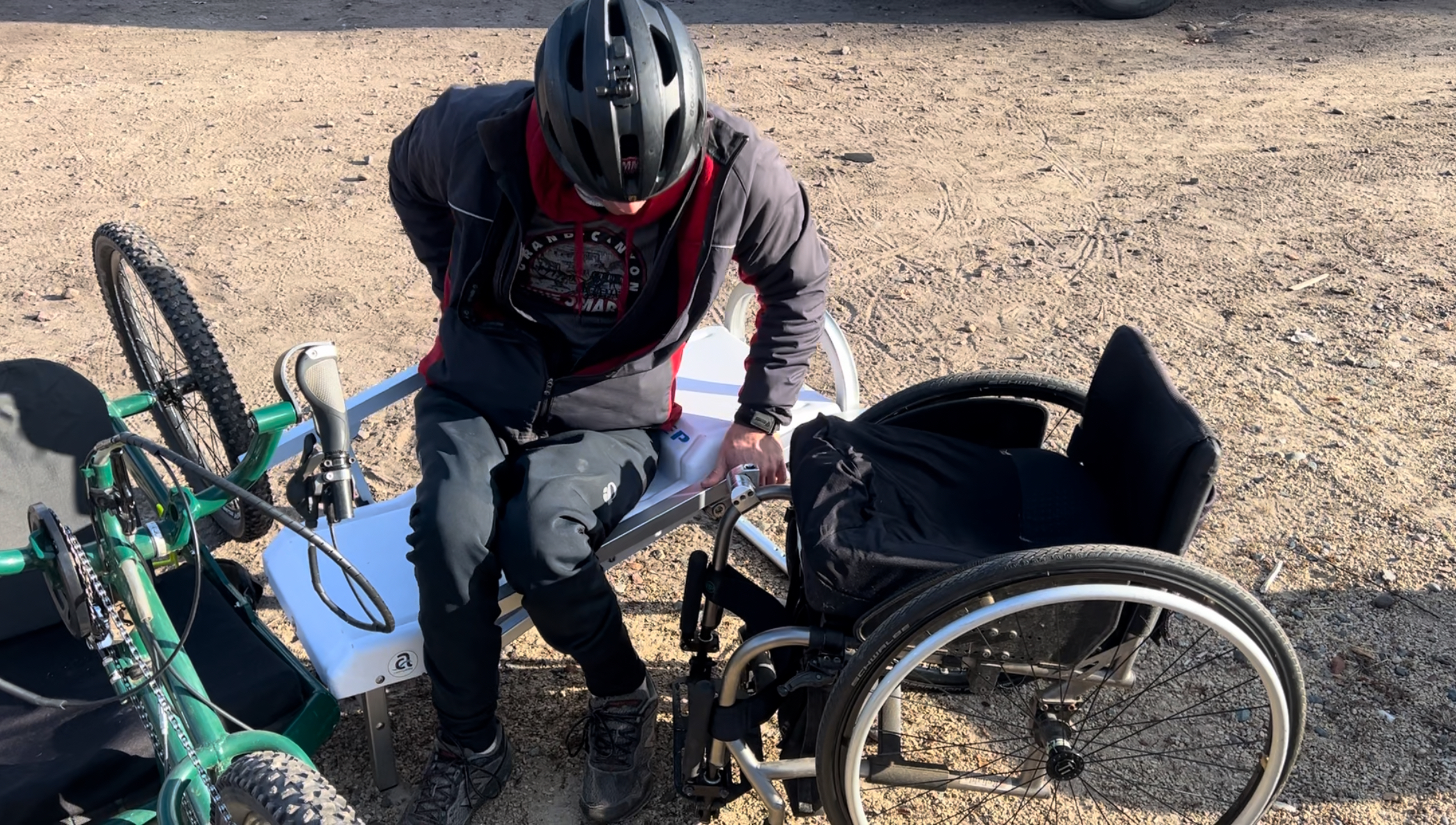 We know that each person’s style of transfer is unique, and that you are the expert when it comes to your own transfers. That being said, the SideStep was developed with a technique in mind. The reason it’s called SideStep is that your legs can remain off to the side during transfer. Your feet never have to leave the ground. As you can see in the photo below, in that position, your hands are at roughly the same level above your waist, with one hand on the seat above and one hand on the side rail behind you. This allows you to elevate evenly while maintaining contact with the floor. The SideStep is great for transferring in and out of handcycles or any other device, giving you the freedom to move from your chair level to the floor or ground, or anywhere in between.